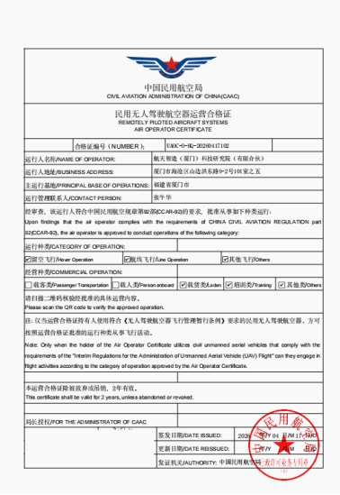 喜讯:航天智造(厦门)研究院获中国民用航空局无人机运营合格证