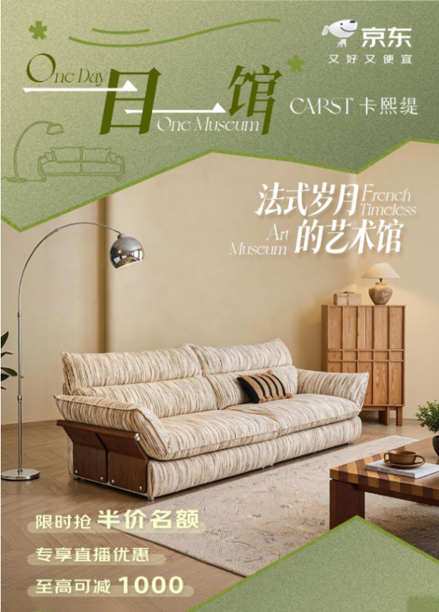 在运营层面,京东摒弃“一刀切”打法,而是根据品牌调性与产品特性定制策略。针对大众爆款,借力“宝藏品牌日”集中引爆;围绕功能床、沙发床、餐桌、衣柜等七大核心品类,采用“每日一主推”的节奏持续牵引用户回访;而对注重设计与美学的原创高端品牌,则创新推出“一日一馆”主题艺术馆直播——博高宜木、时余、卡熙缇、冬熊家居、儒黛、莫语、可纳等七大品牌轮番登场,分别以“休憩”“睡梦”“烟火食光”等沉浸式生活场景,将家具从商品转化为生活方式的表达。配合限时五折、千元直降、抽奖返现等专属福利,极大激发了消费者的焕新热情。