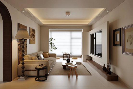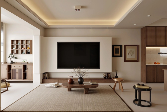 客厅电视柜:和墙面齐平的“悬浮式柜体”,把电视嵌入留白区,下方做木质地台代替传统电视柜,既藏了收纳,又让视觉轻盈不压层高。