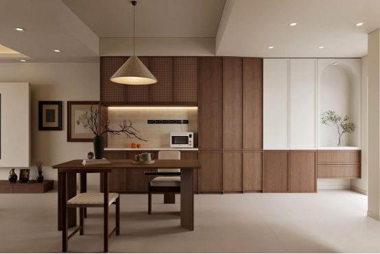 餐厨柜:右边是“木+白”撞色柜,左边用藤编格栅门板做局部点缀,既保留了中古的温润质感,又用半通透设计弱化了柜体的厚重感;连电器都嵌在柜内,“隐形式收纳”让空间更整洁显贵。