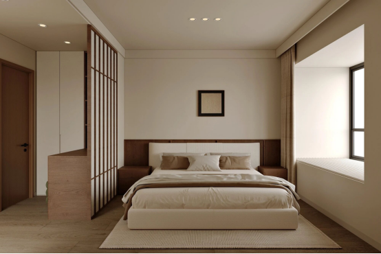 局部点睛:衣柜侧边用木质格栅屏风代替实墙,既做了空间分区,又用中古标志性的格栅元素,把风格“焊”在了细节里。