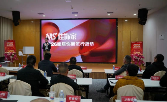 渠道为翼,产品为核。本次峰会特邀成都佳饰家装饰新材料科技有限公司产品总监陈静亲临现场,带来2026年度最新花色鉴赏与重磅推介。从设计源头深度解读新系列花色的核心优势,精准剖析产品组合逻辑与全风格搭配体系。