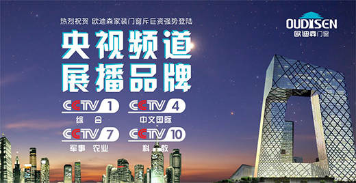 目前,欧迪森门窗已经采用“丝吉利娅SIEGENINA”“HOPPE好博”等的专业门窗配件进行生产制作,加上最新的木纹处理技术与领先的门窗铸造技术的完美运用,欧迪森的企业实力与门窗产品的品质都是同类企业中的佼佼者!加之欧迪森门窗可以适应多种中国主流市场装饰的风格,同时满足客户个性化和特殊构造建筑的要求,达到量身定做的效果。所以欧迪森门窗一经上市就得到了消费者的广泛好评,更是得到了我国副部级事业单位——中央电视台的青睐,强势登上央视荧屏,展播四大频道,给欧迪森的品牌发展之路挥洒下浓墨重彩的一笔!