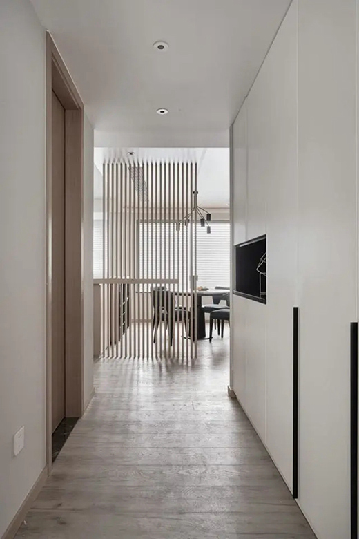进门处有个走廊式玄关空间,设计师正好借助墙面设计了一个嵌入式的置顶玄关柜,全封闭柜收纳全家人的鞋子和生活杂物。