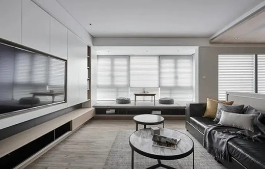 客厅落地窗的小飘窗设计,柜子向外延伸与电视柜相连接,底部留空,可以收纳一些经常看的书籍等,上面铺上软垫,摆上小桌子几个软坐垫,打造出一个休闲区,午后闲暇时刻坐在这喝喝茶,聊聊天,看看书,美哉!