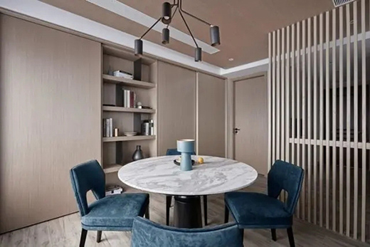 客厅+餐厅一体化设计,沙发背后便是餐厅,餐厅整体以原木色为主,餐厅边上设计一个木格栅屏风做隔断,避免一进门就看到餐厅。