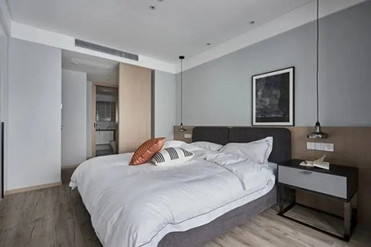 主卧的床头处定制了半包背景矮墙,起到很好的装饰作用,搭配两盏吊灯,整个空间颜值很高!