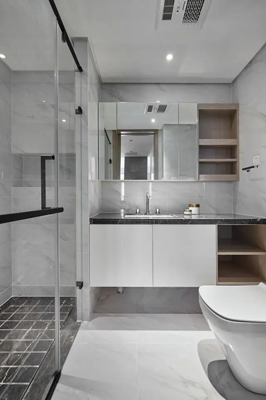 主卧里的卫生间,浴室柜搭配镜柜,增加收纳空间,浴室柜的底部悬空也可以利用来储物。
