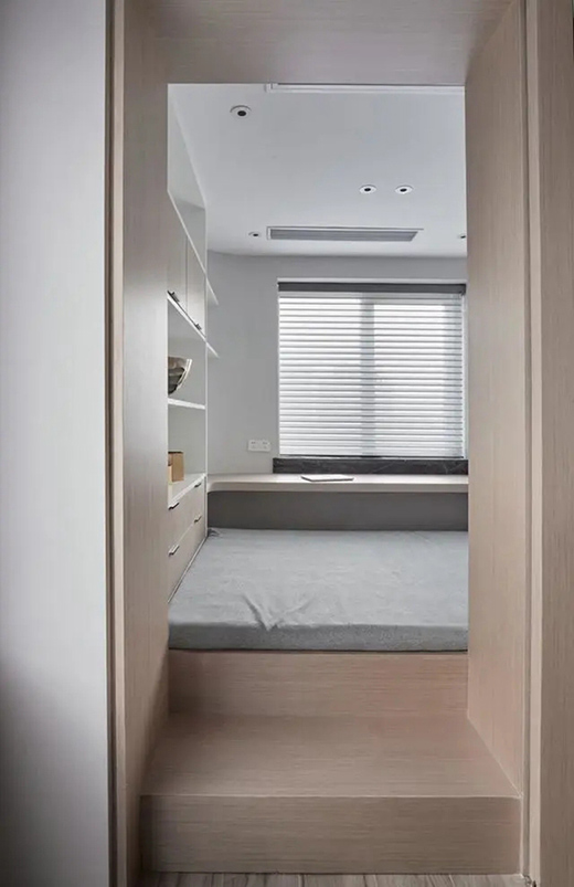 最小空间的一个小卧室,设计师设计成榻榻米休闲房,还可以充当临时客房使用,垫子掀开,为底部榻榻米的收纳储物空间!