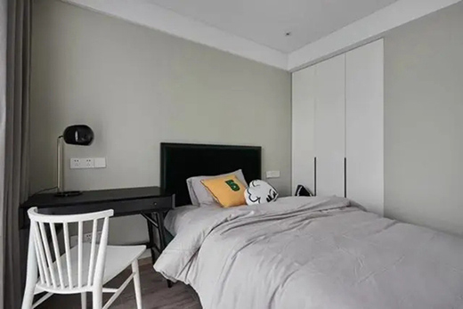 次卧衣柜依旧采用嵌入式到顶设计,节省空间,白色门板搭配长条形黑色拉手,和其他空间的风格保持一致,简单时尚!