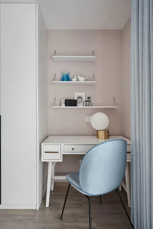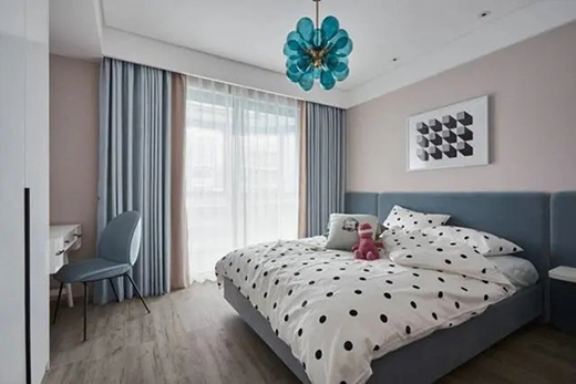 这是女儿房,墙面颜色刷了女儿最喜欢的粉色乳胶漆,搭配蓝色软包床头和窗帘的设计,非常好看!小编也很喜欢这个房间的颜色搭配
