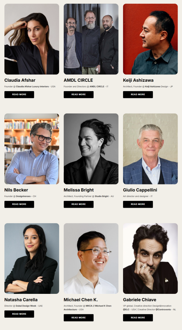 本届赛事评审团堪称"设计界的全明星阵容",汇聚43位全球创意领袖。涵盖建筑、室内、艺术与可持续发展领域。国际评委包括(列举部分):