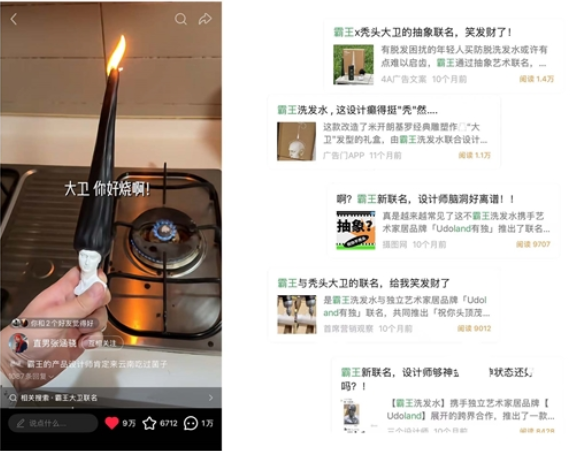 与霸王洗发水的联名,则是一次教科书级别的“逆算法”操作。当“秃头大卫”遇上“防脱霸王”,两个看似毫不相干的品牌碰撞出奇妙的火花。联名礼盒不仅有“秃头大卫蜡烛”,还附赠了可爱的小假发,文案“愿你出走半生,归来仍未秃头”更是将荒诞幽默发挥到极致。网友们自发创作的“大卫瓶盖cos陶喆”等二次创作,让话题热度持续发酵,成为现象级联名。