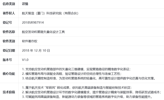- 航天智造(厦门)科技研究院并购航空发动机管路矢量化工具软著 - 2026/03/18