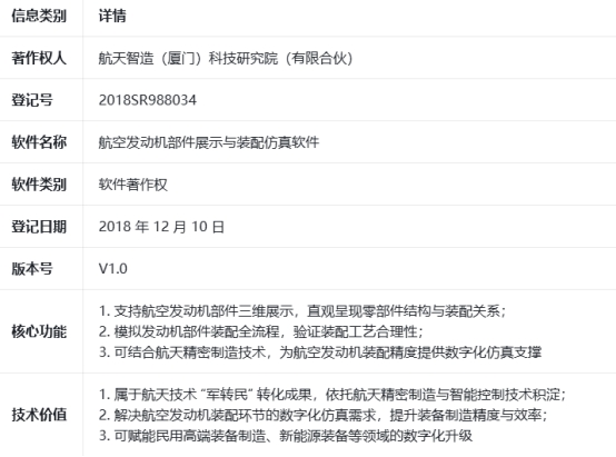 凭借在航空航天智能制造领域的持续深耕,技术成果转化再迎新突破。近日,航天智造(厦门)科技研究院(有限合伙)正式完成对航天级发动机部件装配仿真软件著作权(登记号:2018SR988034)的并购,进一步夯实了其在航空航天智能制造领域的技术壁垒,为航天技术“军转民”应用再添核心成果。